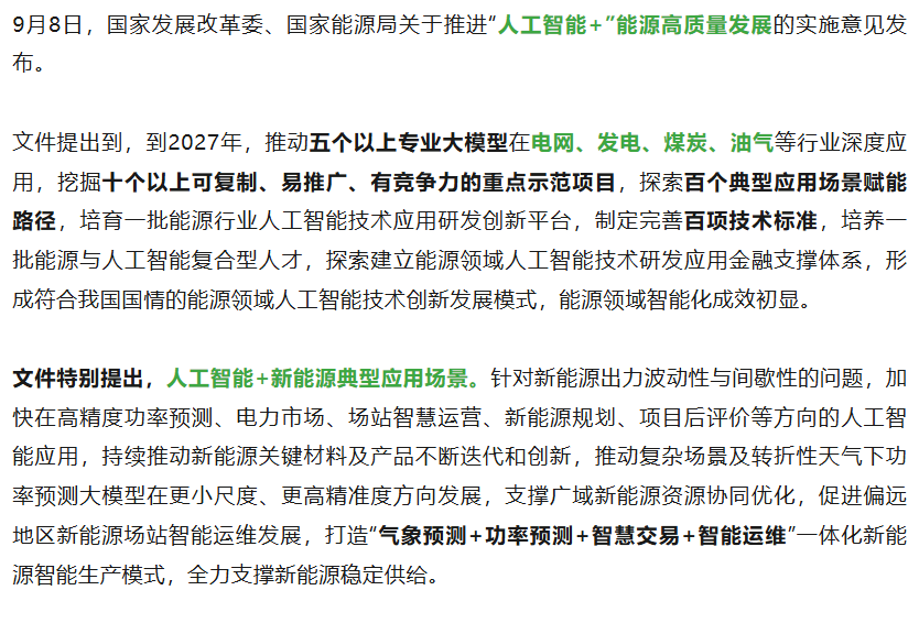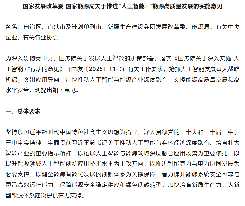 国家发展改革委、国家能源局印发《关于推进“人工智能+”能源高质量发展的实施意见》